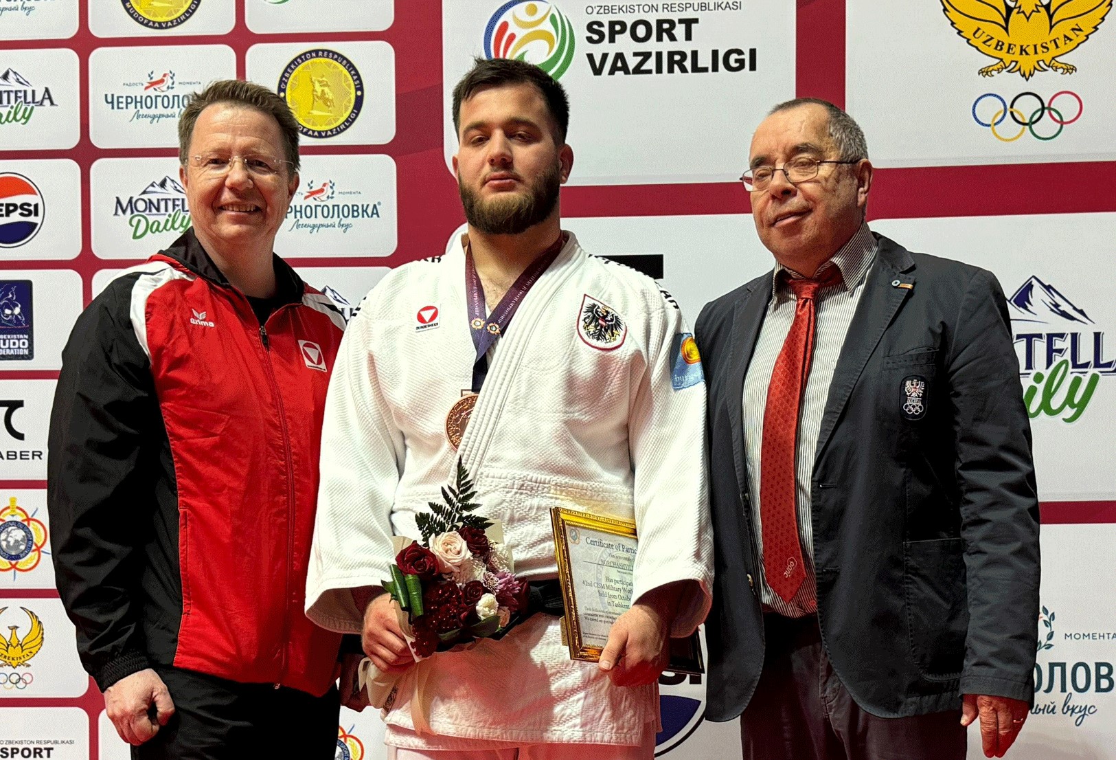 In der Vorrunde besiegte Borchashvilli zunächst Garcia Alejandro Calvo (ESP) und Atamyrat Jumayev (TKM). Im Semifinale kassierte er mit Ippon gegen den zweiten Lokalmatador, Shokhrukh Bakhtiyorov (UZB) die einzige Niederlage in diesem Turnier. Es war die zweite Medaille für Borchashvilli nach World-Tour-Bronze beim Grand-Prix in Zagreb vor vier Wochen: „Ich bin richtig happy mit meiner aktuellen Form. Der Sieg gegen Oltiboev kann sich sehen lassen. Er hat bei den Asien-Meisterschaften Rang drei belegt“, war der Galaxy-Judoka nach der Siegerehrung zufrieden. Da freute sich auch der langjährige Nationaltrainer Bela Riesz (im Bild rechts / @Judo Austria), der mit Ende 2024 – nach 27 (!) Jahren – seine Tätigkeit für den ÖJV beendet und den wohlverdienten Ruhestand antritt.