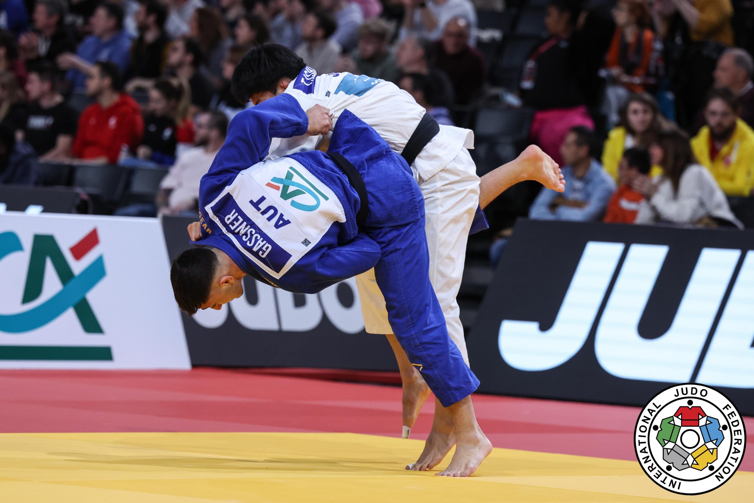 Foto: Samuel GASSNER (blau) bei seinem Erstrundensieg in Paris – @IJF / Emanuel di Feliciantonio