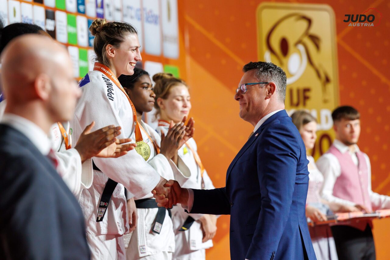 Foto: Ein lange ersehnter Moment: ÖJV-Präsident Martin POIGER gratuliert Michaela POLLERES zum Sieg beim Heim-Grand Prix - @Judo Austria / Oliver Sellner