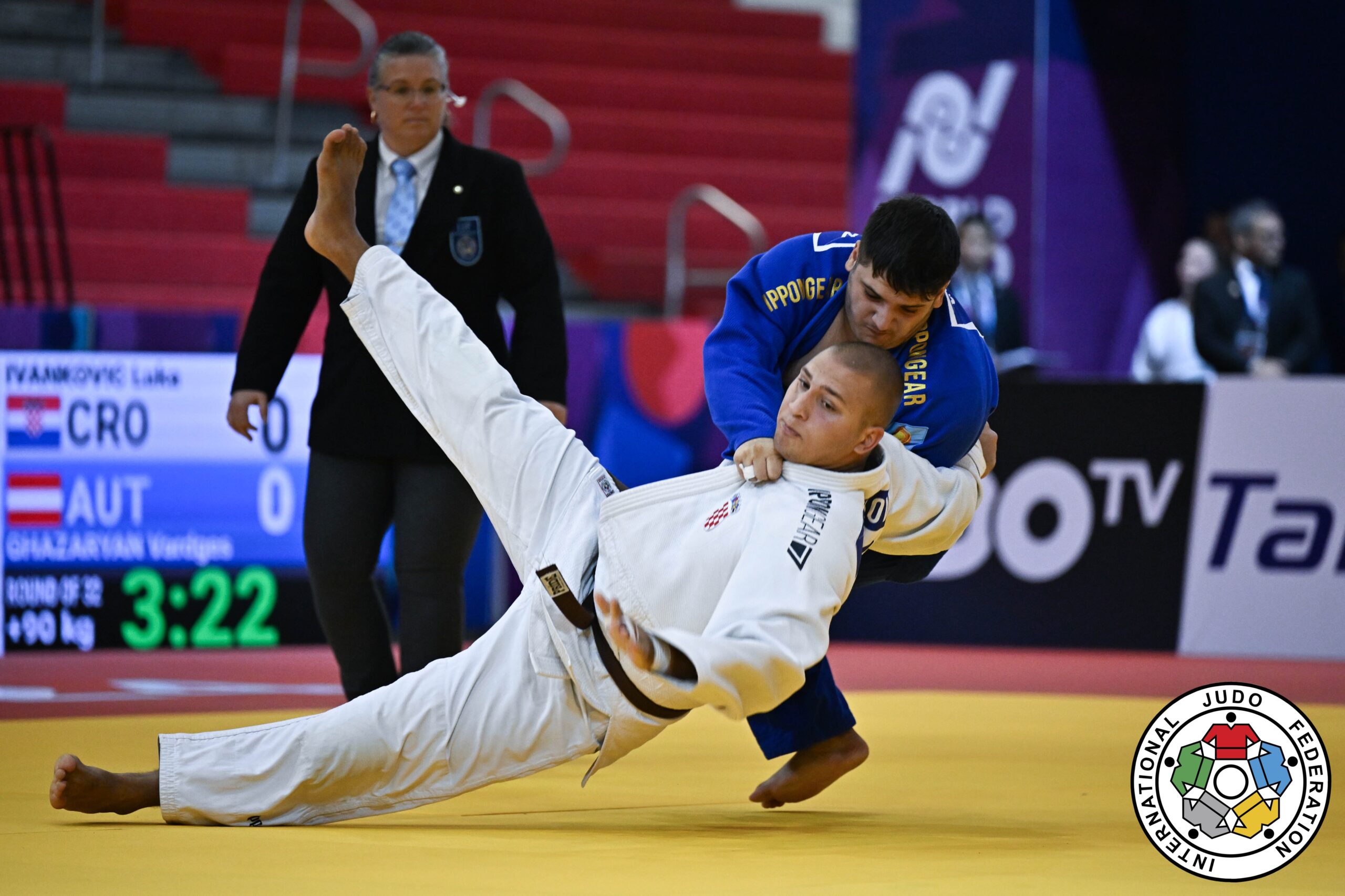 Foto: Vardges GHAZARYAN (blau) wirft Luca IVANKOVIC schon nach wenigen Sekunden Ippon - @IJF/Tamara Kulumbegashvili