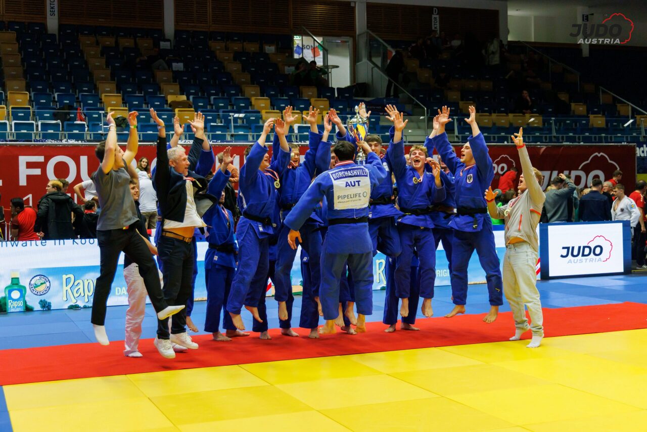 Foto: So jubelten die Galaxy Judo Tigers mit ihrem Coach und Trainer Thomas HAASMANN im Vorjahr über ihren elften Meistertitel - @Judo Austria / Oliver Sellner