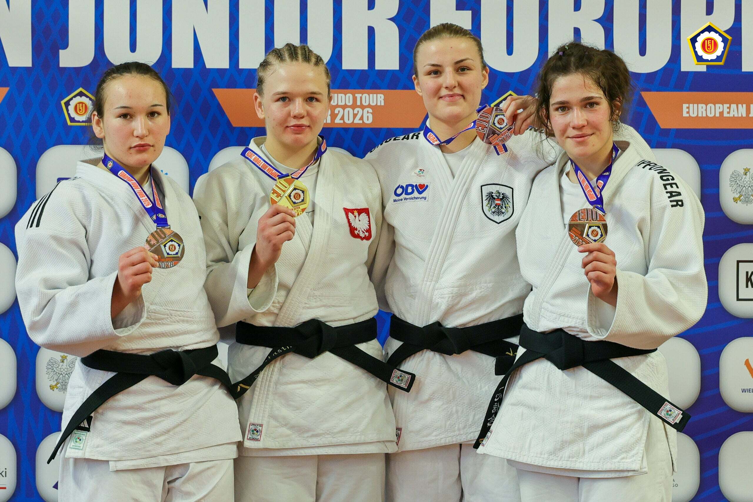 Foto: So lächelte Leonie BAYR (Zweite von rechts) als Dritte vom Podest des U21-Europacups in Posen – @EJU / Rafal Morawski