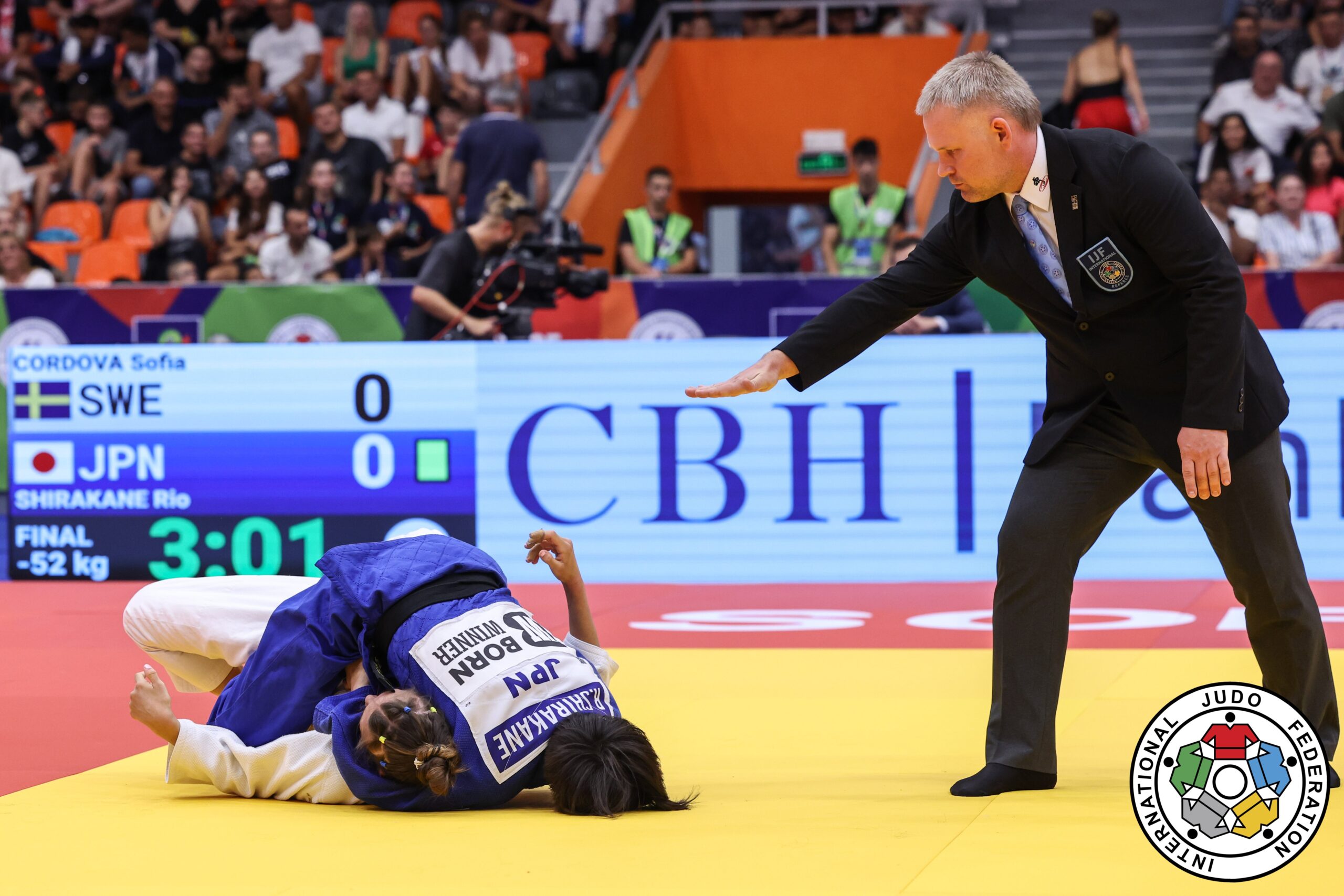 Foto: Rio SHIRAKANE hält ihre schwedische Finalgegnerin Sofia CORDOVA mit Tate-shiho-gatame fest - @IJF/Emanuele Di Feliciantonio