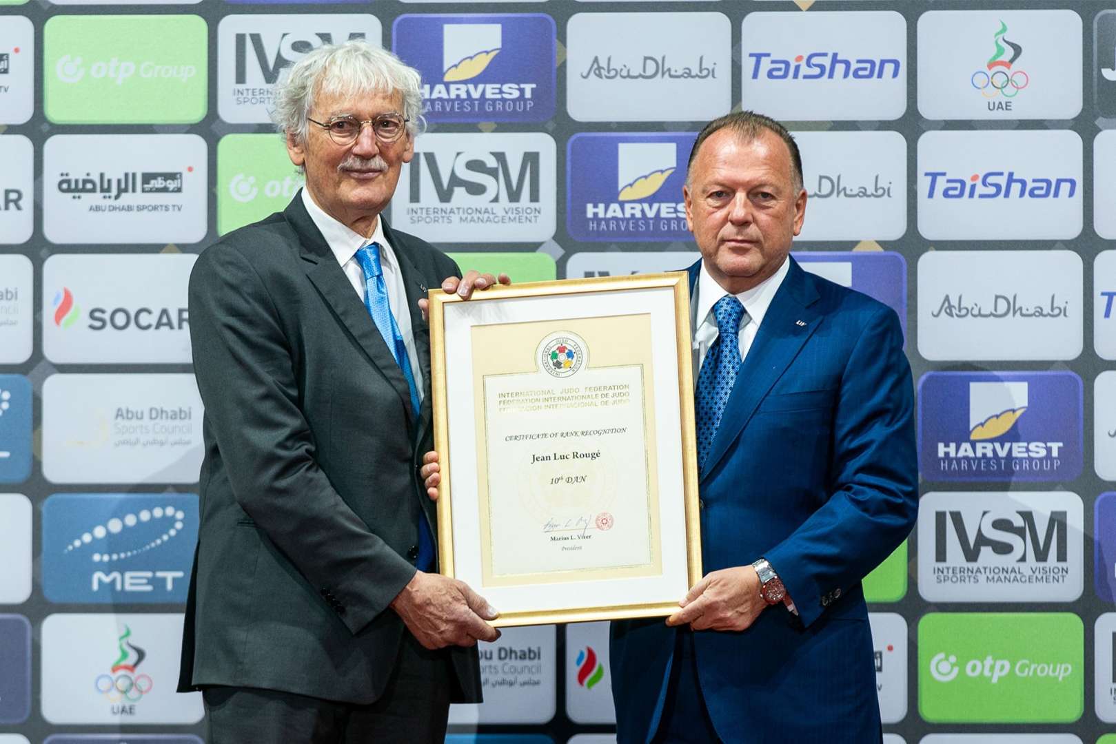 Foto: 10. Dan für Jean-Luc Rouge (links) aus den Händen von IJF-Präsident Marius Vizer - @IJF Media / Vianney Thibaut