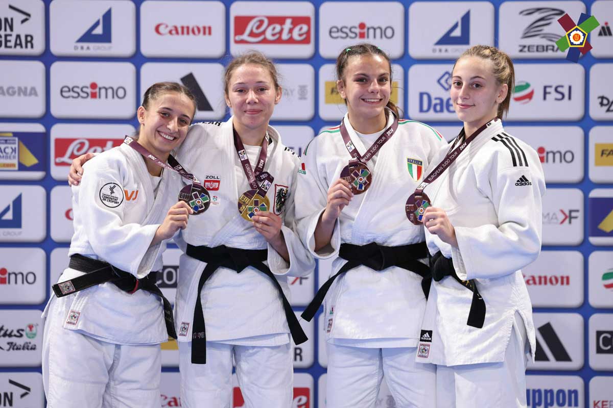 Der zweite Europacupsieg nach Tallinn 2023 – Jacqueline SPRINGER (Zweite von links) auf dem obersten Podest!. Foto: @IJF/Emanuele Di Feliciantonio